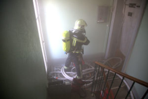 Une fois équipés, trois porteurs d’appareils respiratoires montent à l’étage en déployant en même temps les conduites. Une personne reste à l’entrée de l’appartement et installe le rideau stop-fumé pendant que nous finissons de mettre les tuyaux en place et que nous demandons de l’eau.